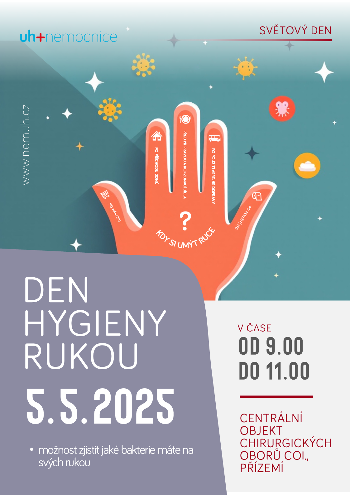 Program Dne hygieny rukou v Uherskohradišťské nemocnici se uskuteční v čase od 9 do 11 hodin v přízemí centrálního objektu chirurgických oborů (budova C).