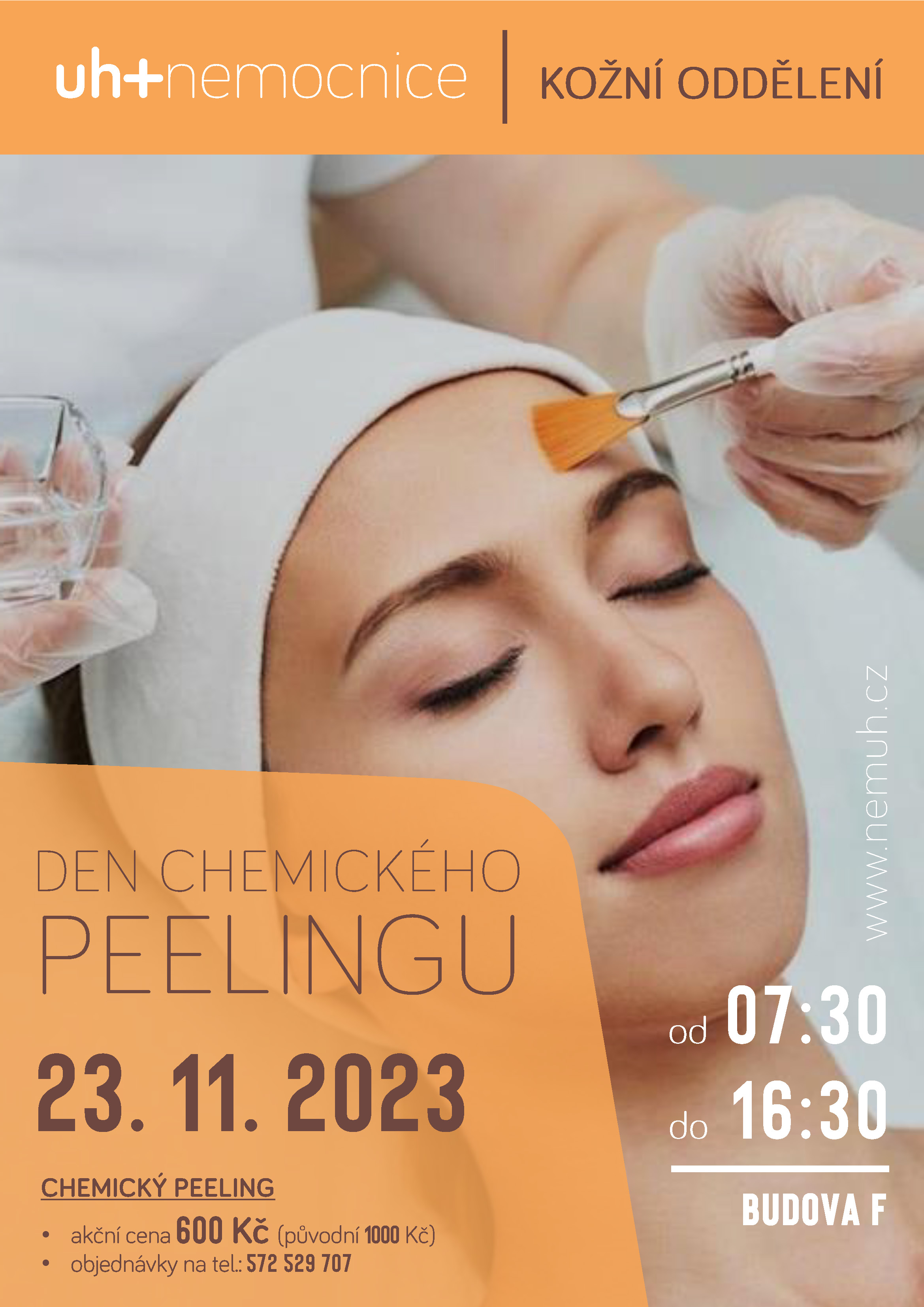 Hýčkejte svou pleť i v podzimních měsících a využijte jedinečnou nabídku účinné kosmetické procedury za akční cenu. Ve čtvrtek 23. listopadu se na kožním oddělení uskuteční DEN CHEMICKÉH PEELINGU. Toto ošetření pleti je doporučováno k léčbě akné, odstranění nežádoucích pigmentací, vyhlazení pleti či zmírnění projevu jejího stárnutí.