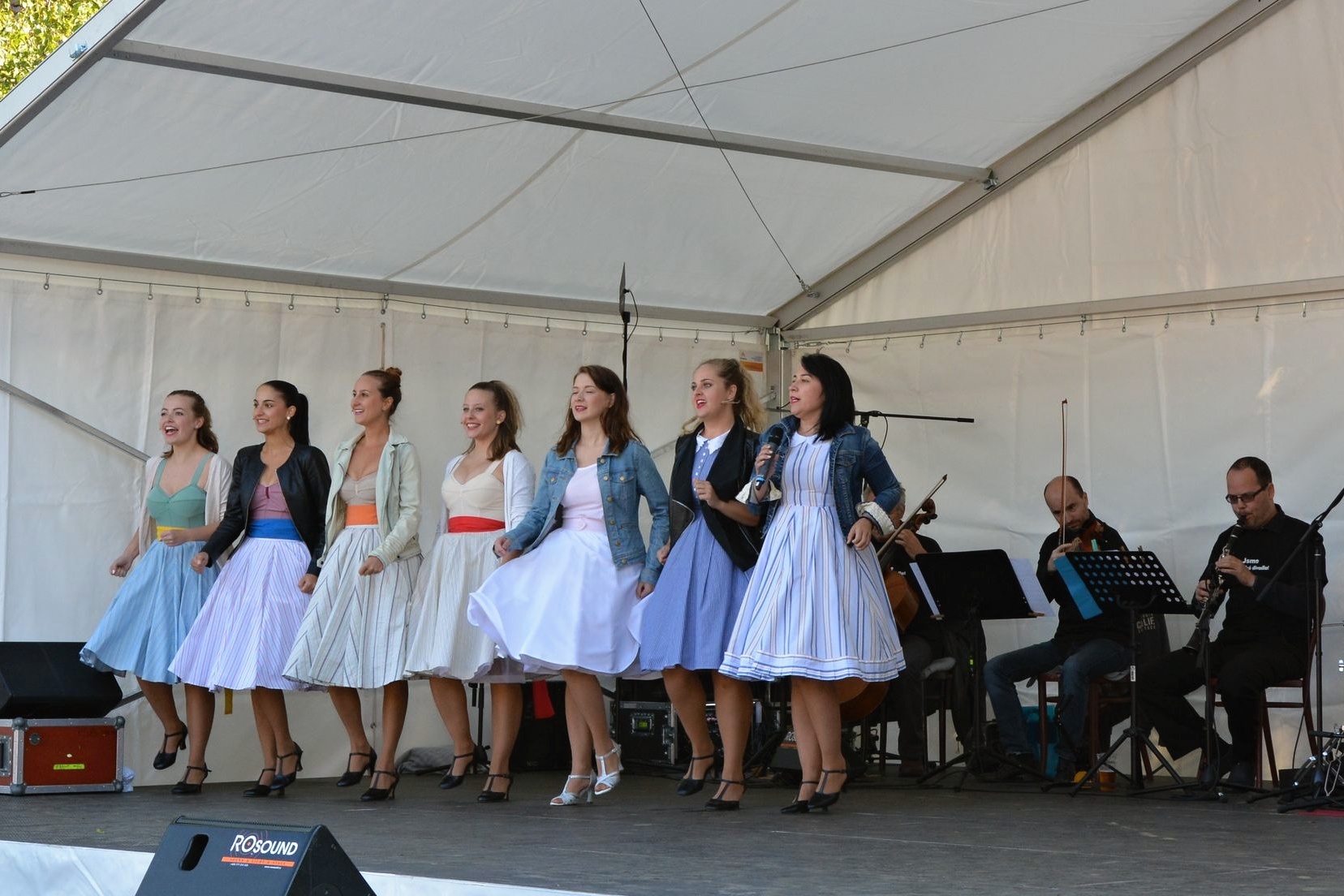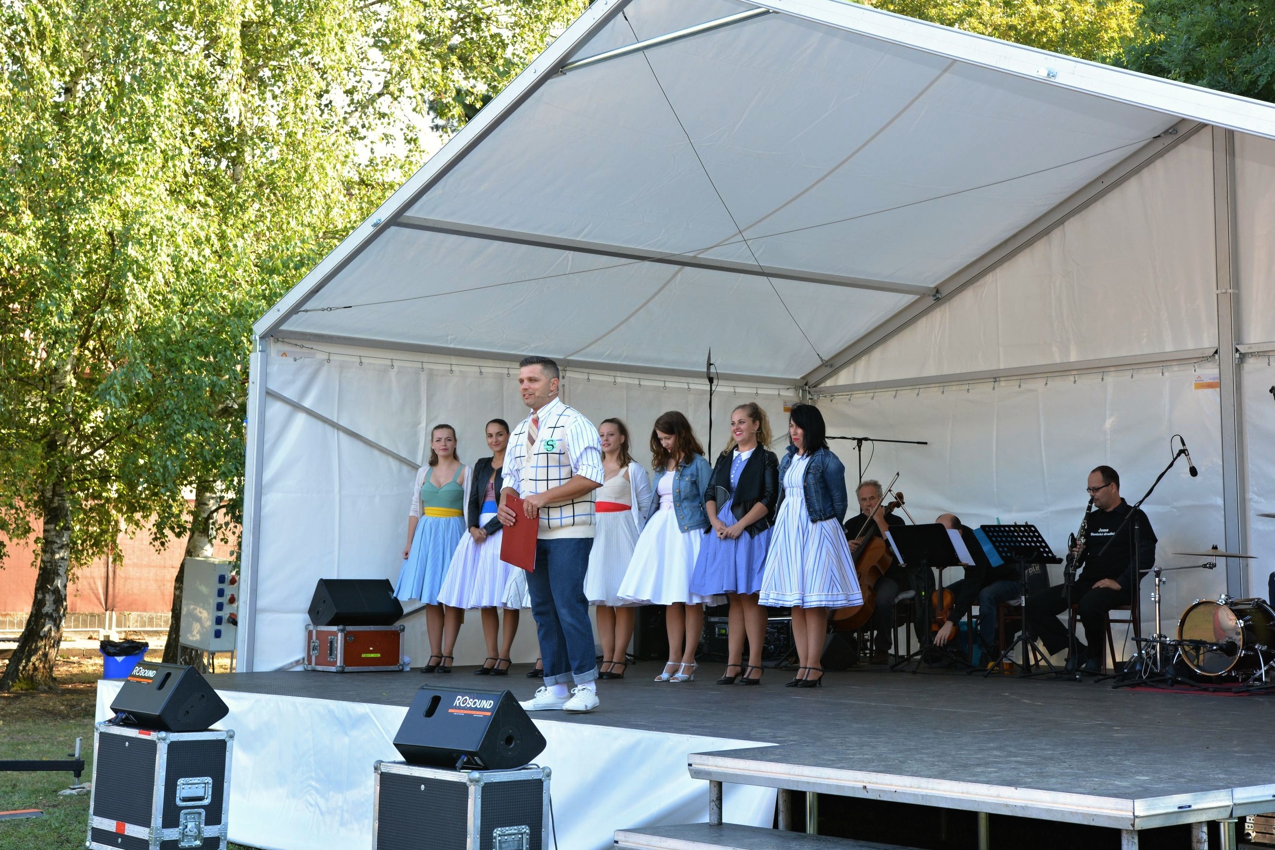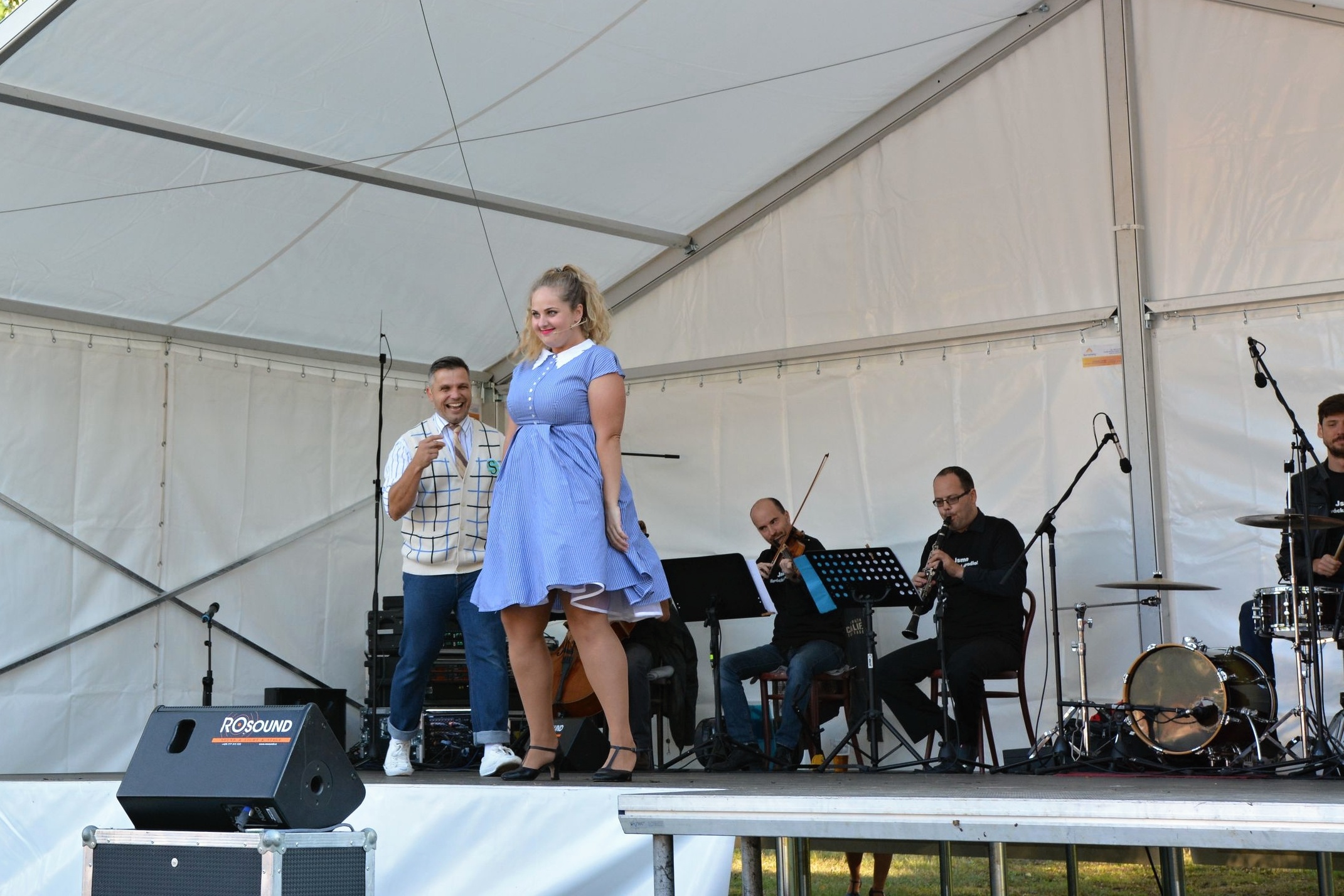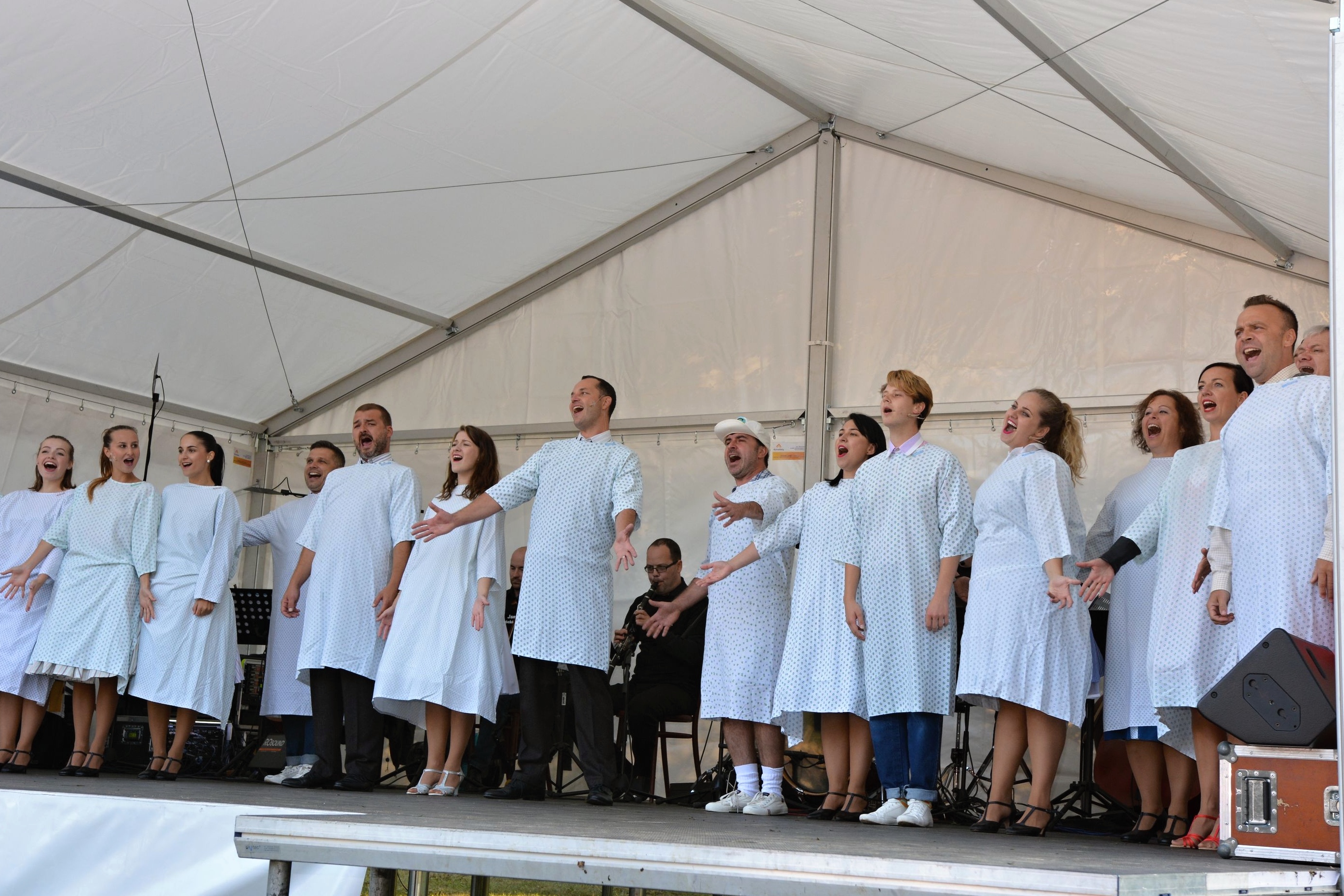 Přesně s úderem čtvrté odpolední se heliport nemocnice rozzářil slunečními paprsky, a tak se herci Slováckého divadla mohli převléct do svých pestrobarevných retro kostýmů, které muzikálu dodávají na rozvernosti. „Pokud by byla taková zima jako během zkoušek, odehráli bychom to v civilu a lidem se omluvili. Bylo opravdu velké chladno, naštěstí jsme ale k této variantě nemuseli přistoupit,“ řekl David Vacke, herec a moderátor benefičního odpoledne.