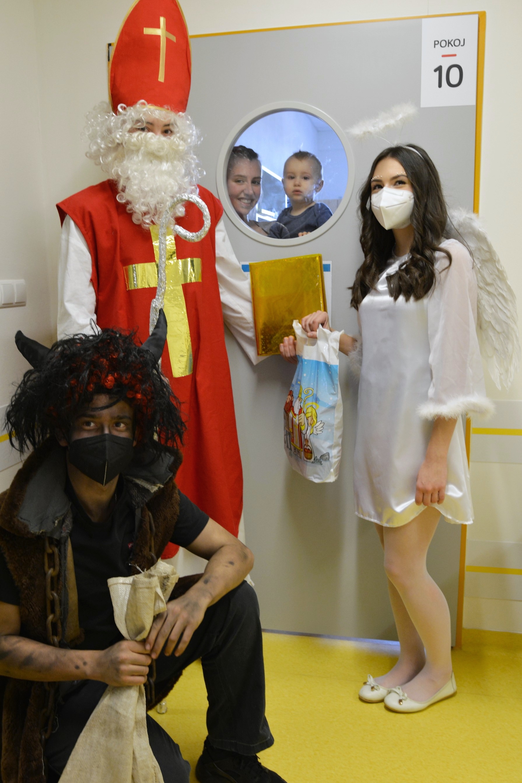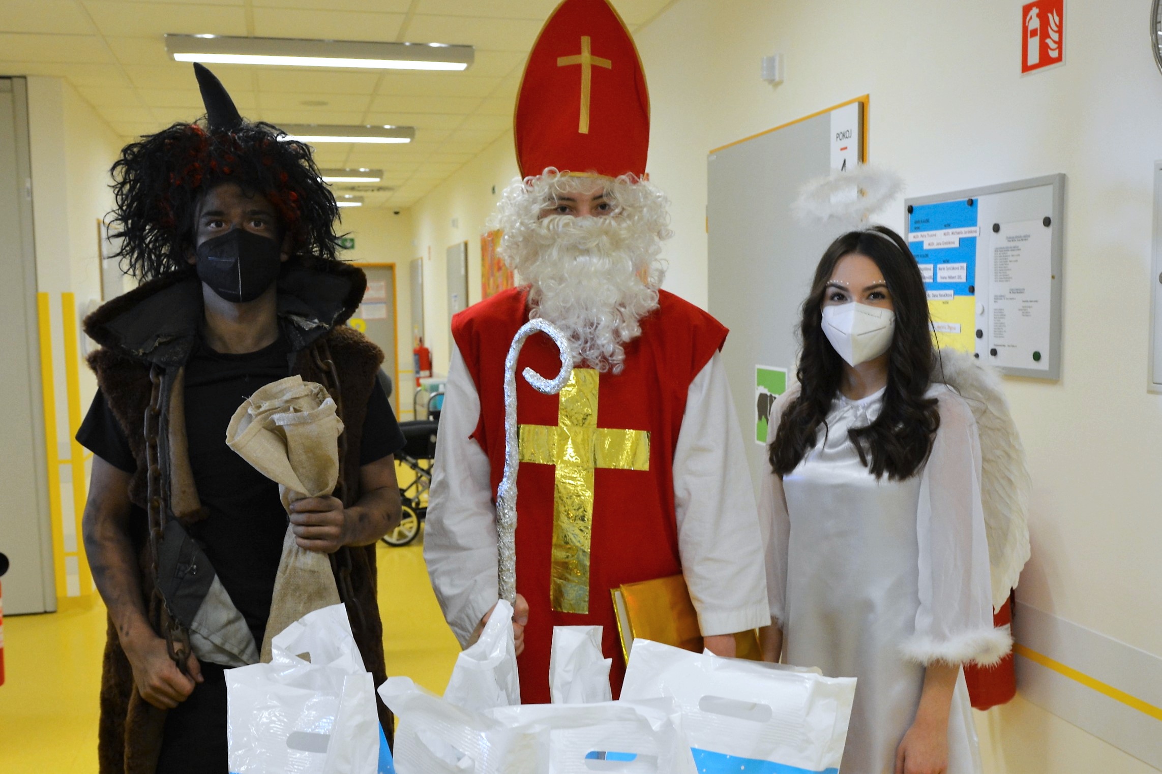 Do kostýmů svaté trojice se i v tomto roce převlekli studenti Střední školy průmyslové, hotelové a zdravotnické. Nemocniční prostředí jim není cizí, dochází sem v rámci praxe a svých rolí se zhostili dokonale. Nadílku tvořili darované výrobky z firmy Hamé, dobroty připravil i stravovací provoz Uherskohradišťské nemocnice.