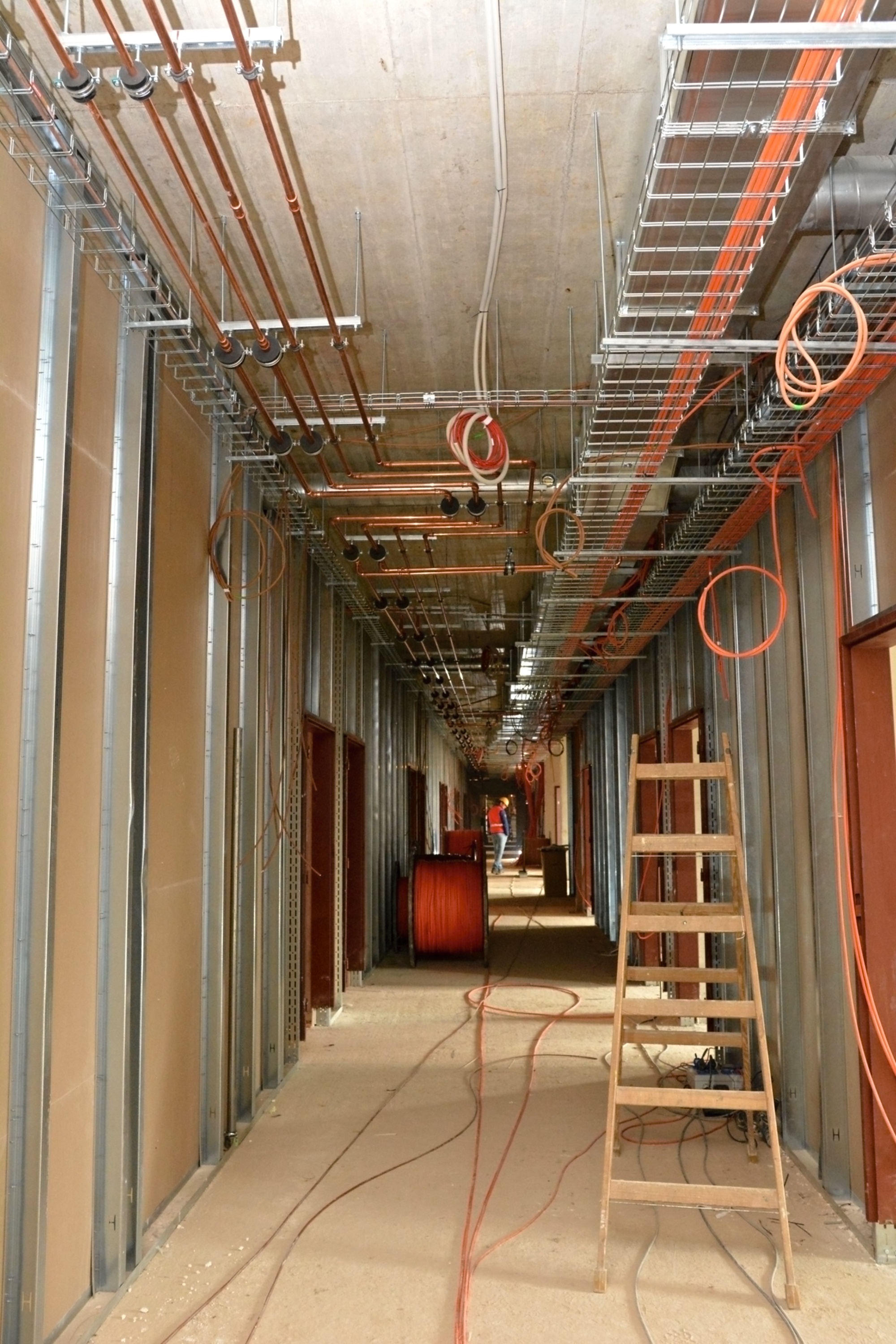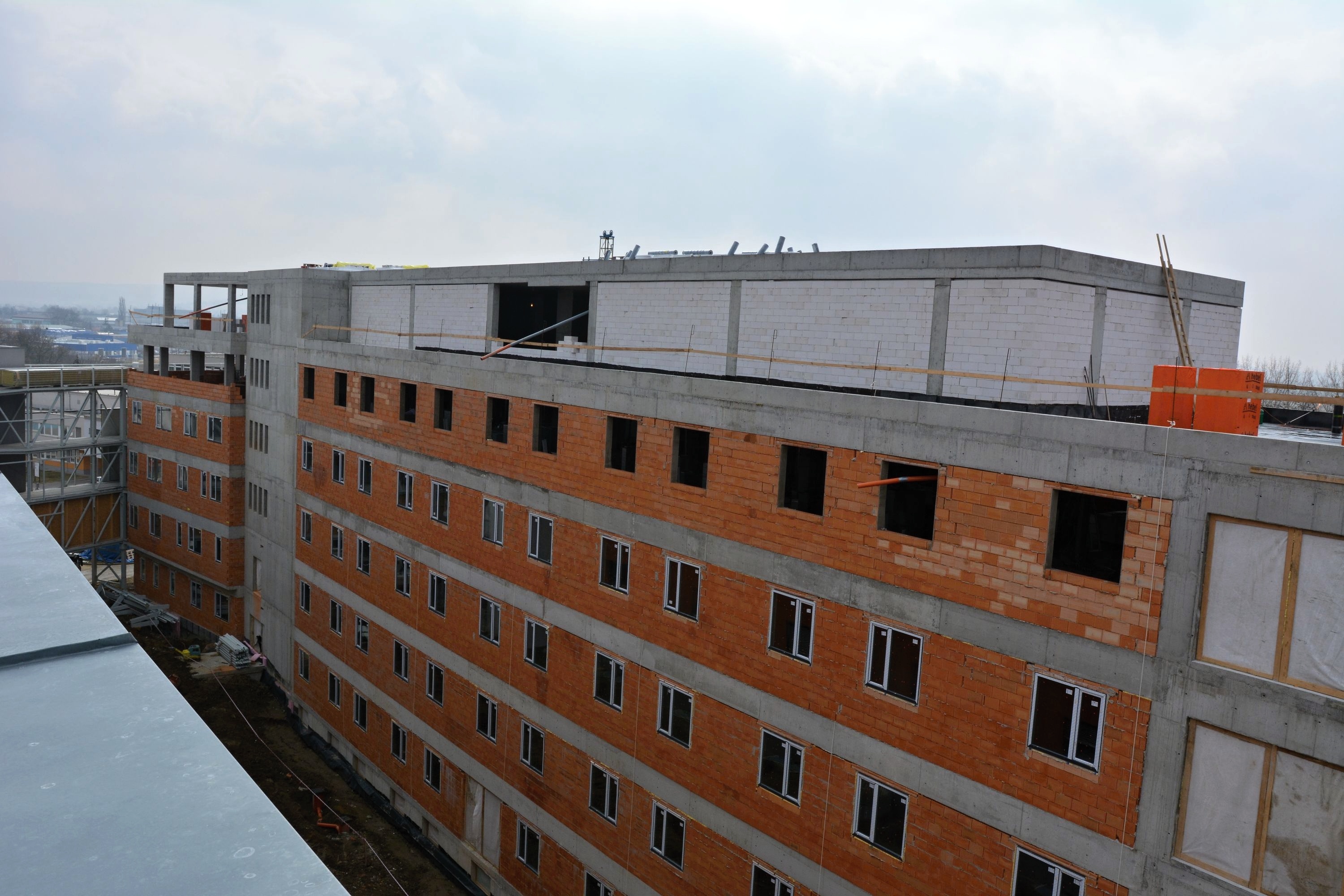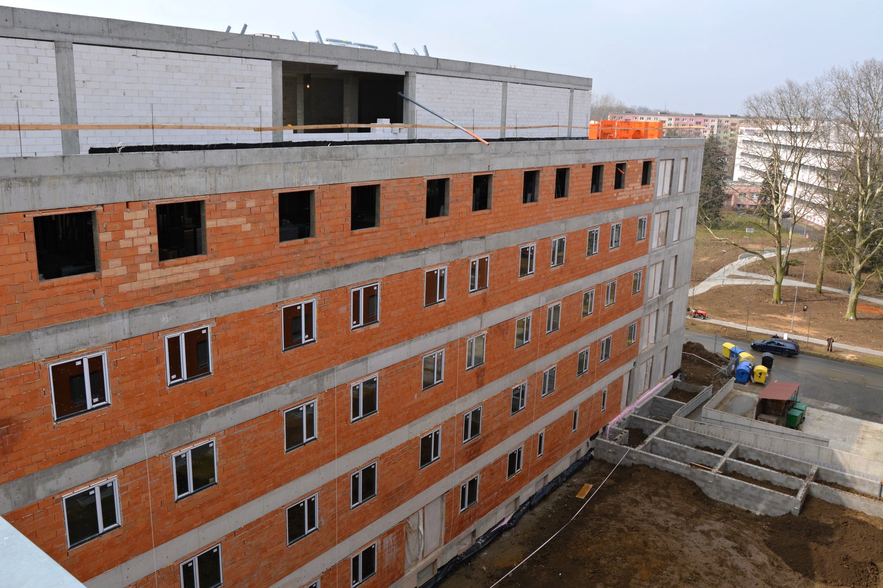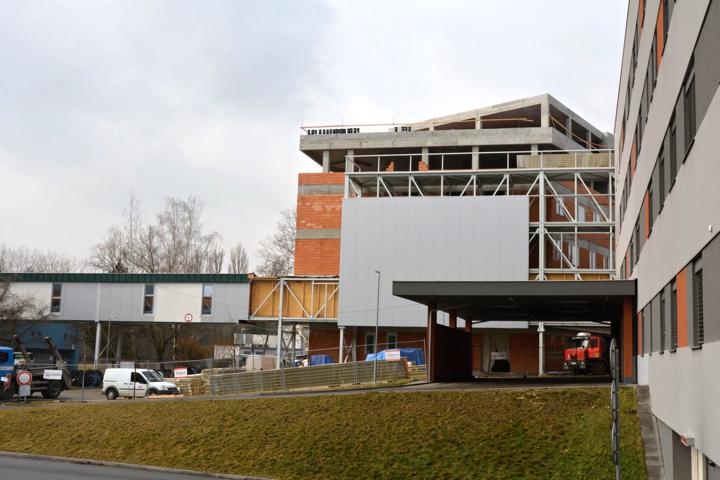 Letos v únoru byla dokončena monolitická konstrukce stavby. V současné době stavbaři dokončují první vrstvu hydroizolace střech a základy pro spojovací krček a rozšíření rampy.