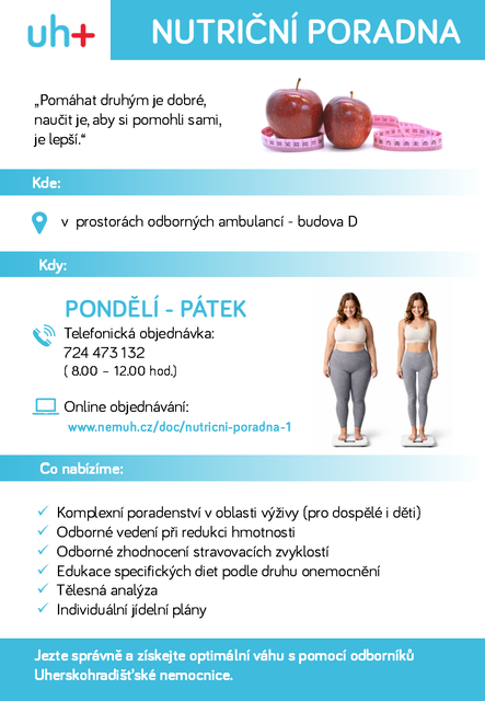Pro objednání do nutriční poradny volejte, prosím, v době pondělí - pátek 8 - 12 hodin na tel. číslo: 724 473 132. Při zrušení termínu formou SMS uveďte, prosím, jméno a termín objednání.
