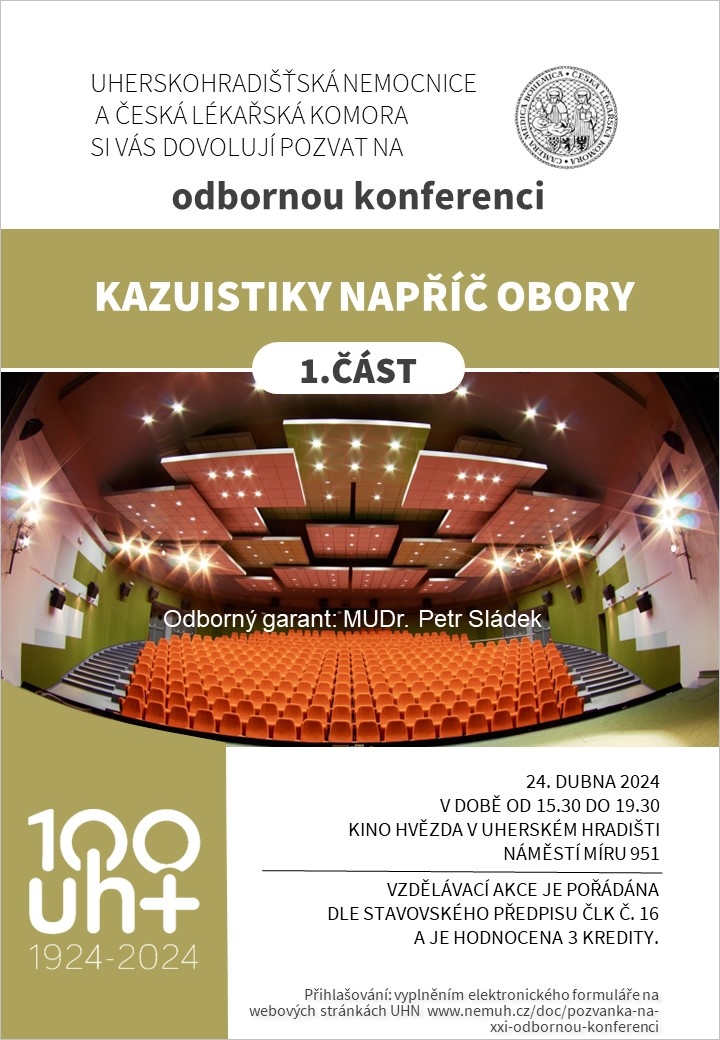 Srdečně Vás zveme na Odbornou konferenci Uherskohradišťské nemocnice a. s.- KAZUISTIKY NAPŘÍČ OBORY (1.část), která se uskuteční 24. 4. 2024 v místě: KINO HVĚZDA, NÁMĚSTÍ MÍRU 951, UHERSKÉ HRADIŠTĚ