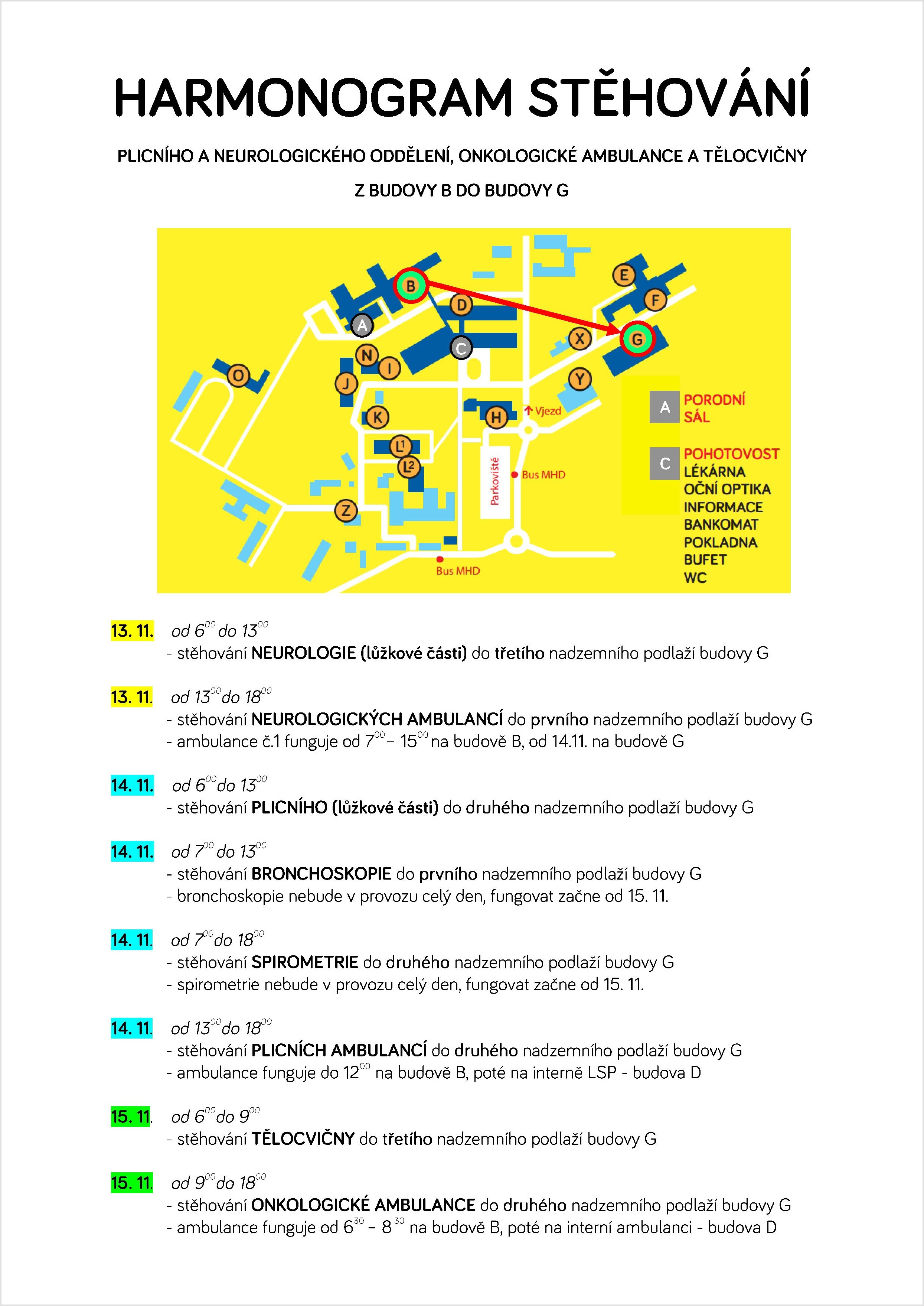 Přesun pracovišť z budovy B do budovy G bude probíhat od středy 13. do pátku 15. listopadu 2019, přičemž ve středu se stěhuje neurologického oddělení, ve čtvrtek plicní oddělení a v pátek tělocvična porodnicko gynekologického oddělení a pracoviště onkologie. V budově B nadále zůstanou pracoviště mamografie, rentgen pro ambulantní pacienty odesílané externími lékaři, CT přístroj, sonografie a ambulance ARO. „Vše jsme naplánovali tak, aby se stěhování dotklo našich pacientů co možná nejméně. Na plánovanou péči do ambulancí těchto oddělení jsme nikoho na tyto termíny neobjednávali, vždycky jsme také zachovali provoz alespoň jedné ambulance, aby byla zajištěna akutní péče. Úplně uzavřená tak zůstane na jeden jediný den ve čtvrtek pouze spirometrie a bronchoskopie. Nakonec jsme neomezili ani návštěvy u pacientů ležících na plicním a neurologickém oddělení. Věříme, že vše proběhne bez větších potíží,“ popsala Jitka Bílková.