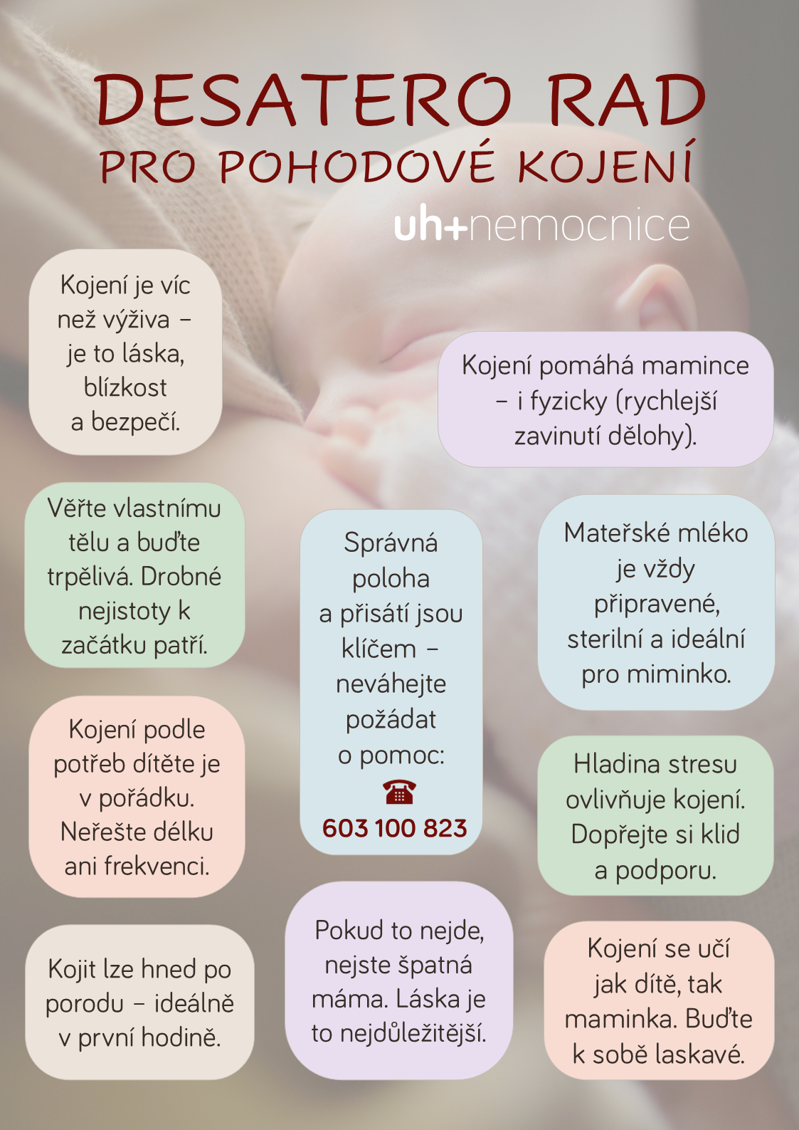 Výborným rádcem nejen pro kojení je pak brožurka Poznávej své dítě, kterou po porodu dostane každá maminka. V elektronické podobě je k dispozici na webových stránkách nemocnice. Tamtéž a také na podcastových platformách mohou zájemci vyslechnout podcast Pulsování s Mgr. Půčkovou, zaměřený na kojení. Podporou pak může být i motivační infografika Uherskohradišťské nemocnice, která nabízí desatero rad pro pohodové kojení.