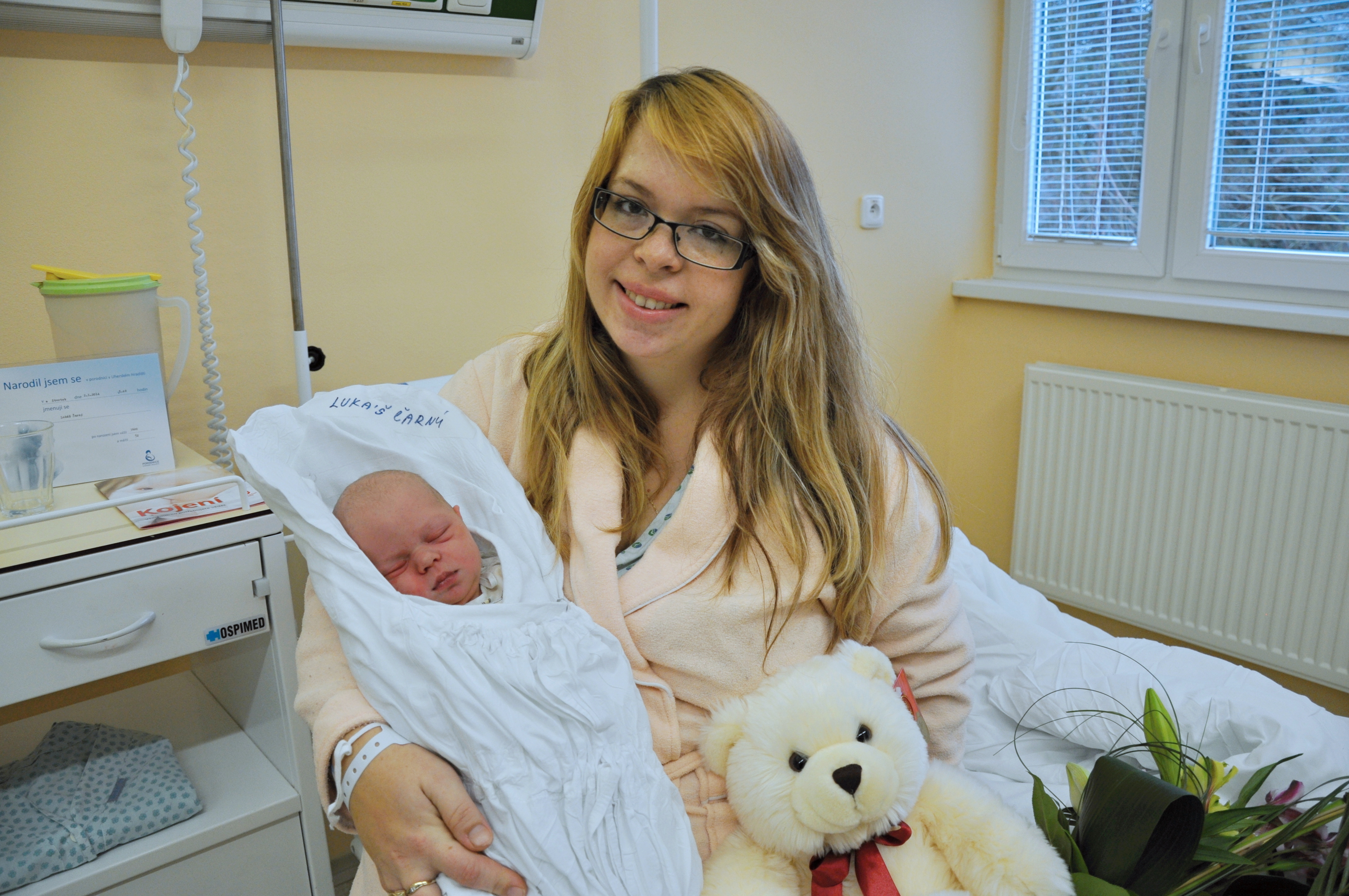 „Původně jsem měla termín na Štědrý den, ale nakonec to vyšlo až 2 ledna,“ okomentovala Pavla Čarná porod, který proběhl rychle a bez komplikací i za účasti tatínka. Novorozený Lukáš je jejím druhým dítěte, první Eva se také narodila v Uherskohradišťské nemocnici, ale už před necelými třemi lety. Lukáš při narození vážil 3 600 g a měřil 52 cm. Spokojené mamince kromě zástupců nemocnice popřál k synovi také náměstek hejtmana Zlínského kraje MUDr. Lubomír Nečas.