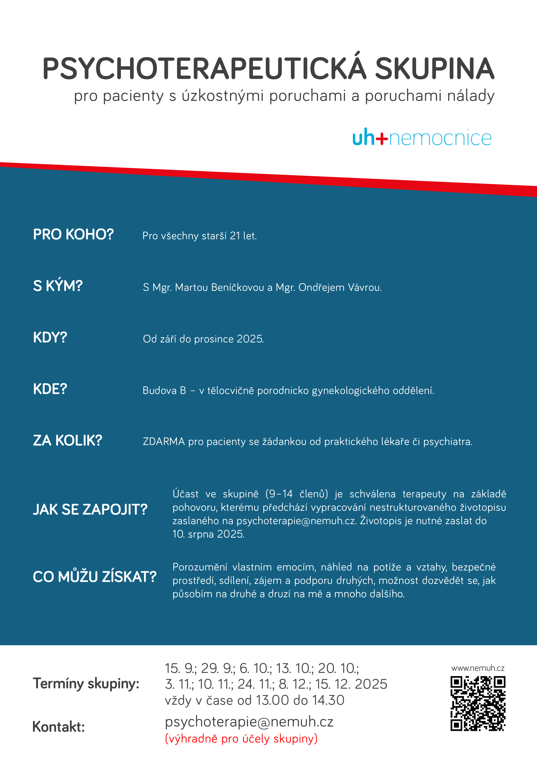 Oddělení klinické psychologie otevře psychoterapeutickou skupinu pro pacienty s úzkostnými poruchami a poruchami nálady. Podrobnosti nabízí přiložená přehledná grafika.