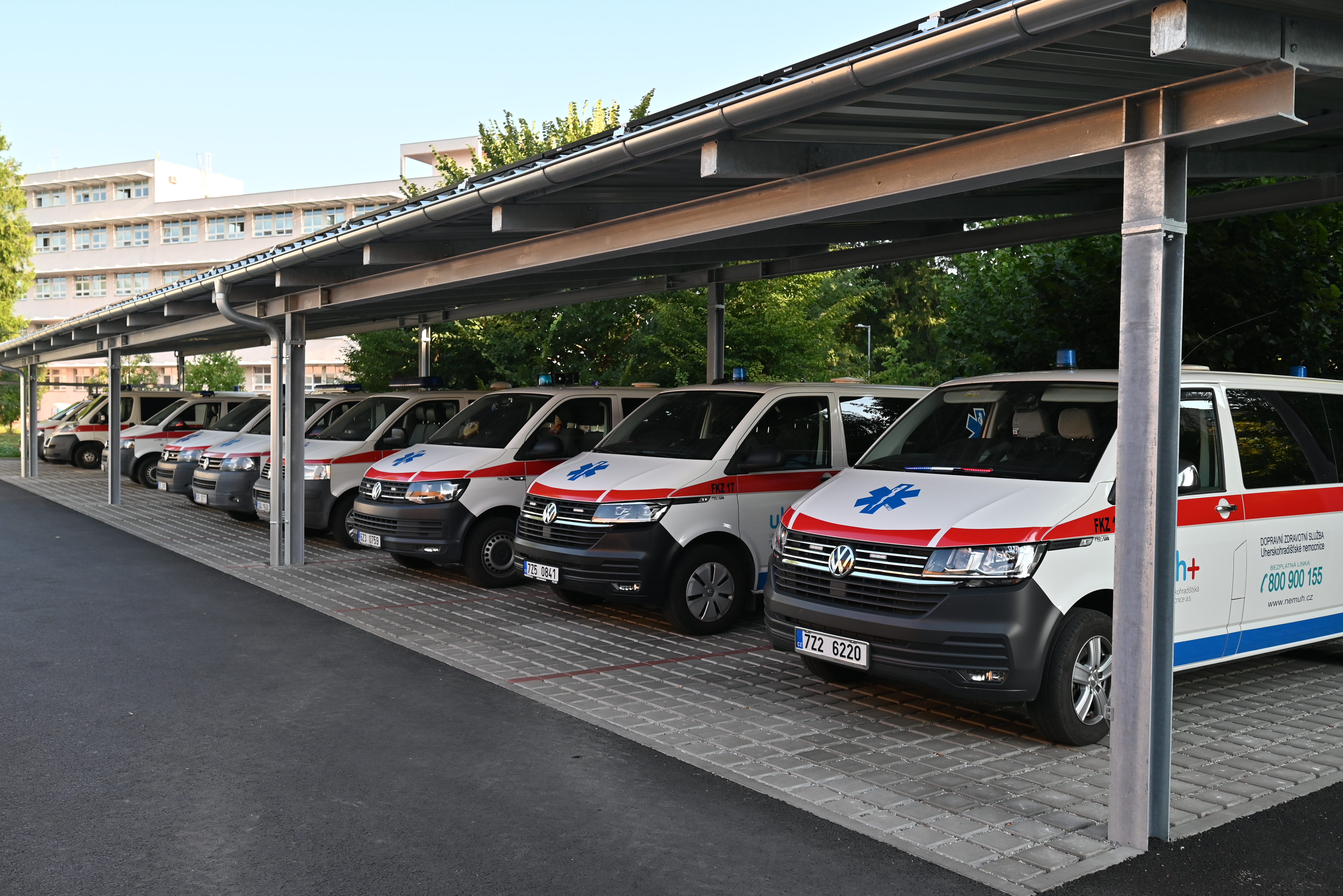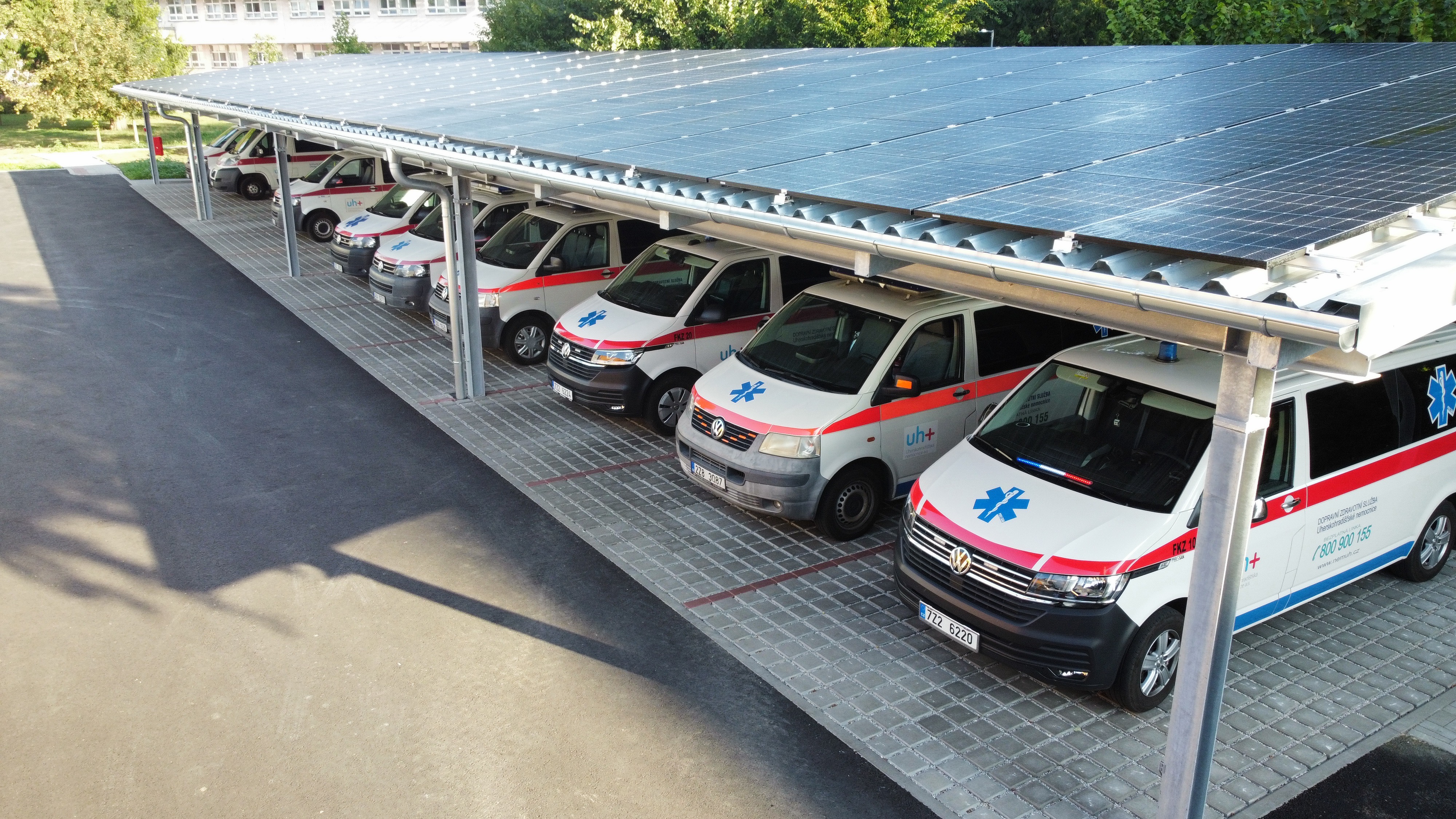 Sanitky parkují pod novým přístřeškem s fotovoltaickou střechou