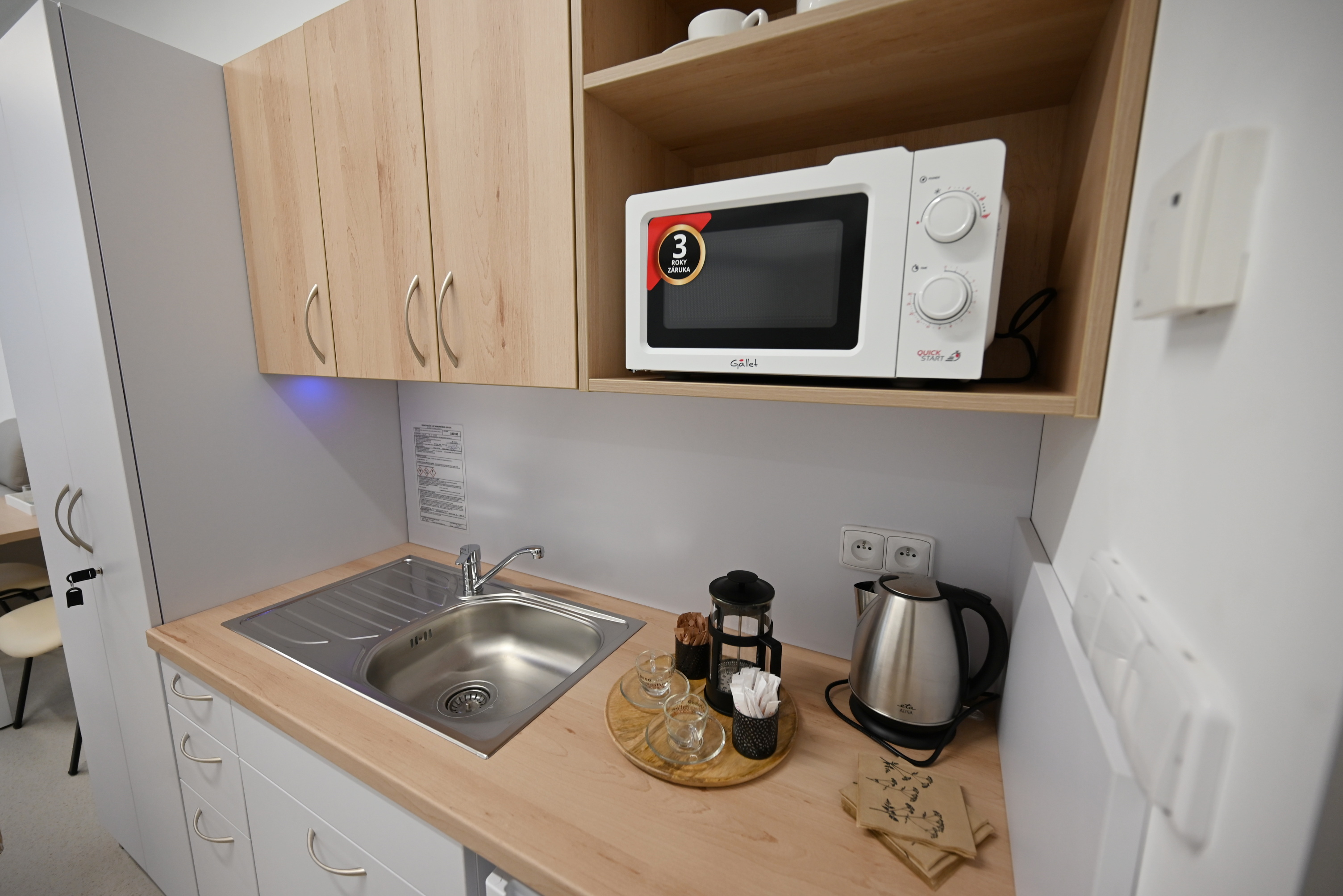 Na všech pokojích se nachází elektrická polohovatelná lůžka, klimatizace, noční světlo nad lůžkem, signalizační zařízení, připojení pro kyslík, uzamykatelná skříň, noční stolek, stolek a židle, umyvadlo, vanička pro miminko a přebalovací pult. Na nadstandardních pokojích je navíc lednice a kuchyňka vybavená nádobím.